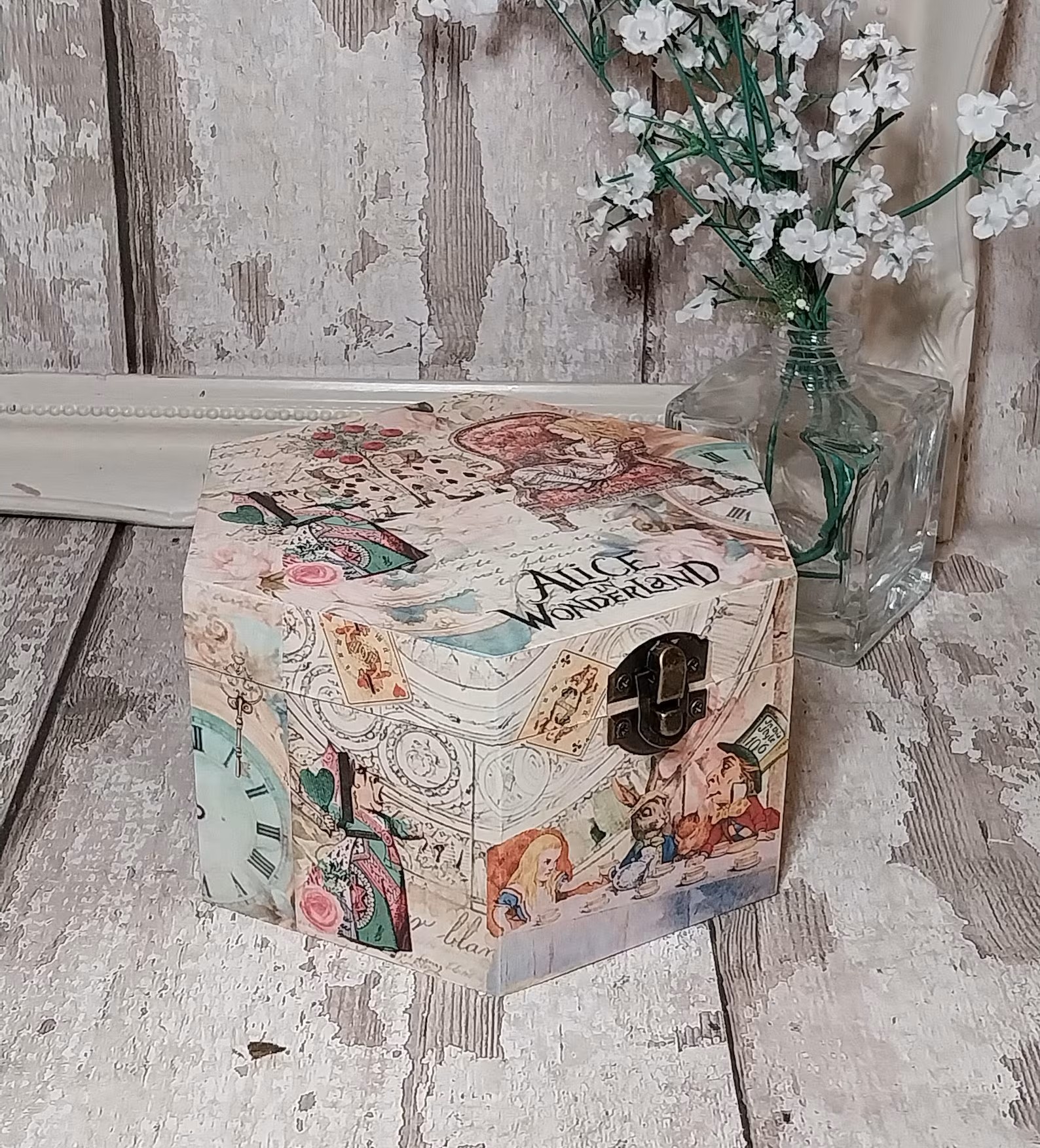 Embark on a whimsical adventure with this enchanting Alice in Wonderland jewellery box! Crafted with care and creativity, this wooden hexagon keepsake storage is a true treasure for fans of the beloved tale. Adorned with intricate illustrations of the Mad Hatter, White Rabbit, and the Queen of Hearts, each stroke of the brush captures the magic of Wonderland.