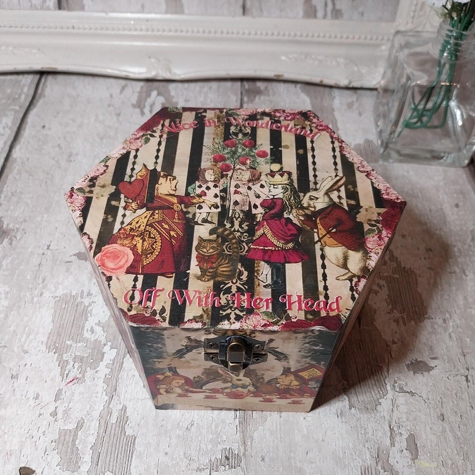 Alice in Wonderland jewellery box. Wooden hexagon keepsake storage. Mad Hatter, White Rabbit, Queen of hearts. – Artsy Craftsy