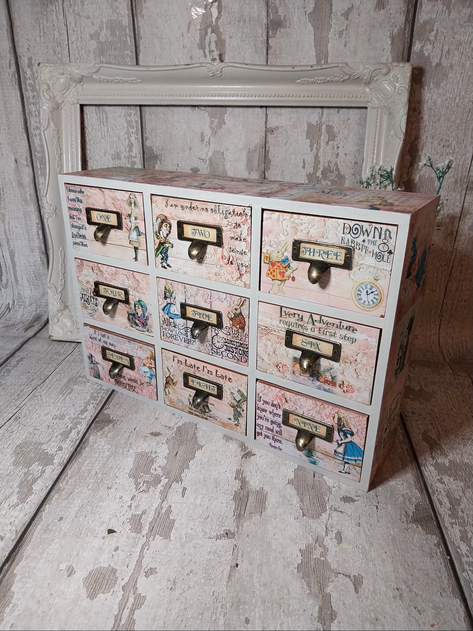 Embark on a whimsical journey down the rabbit hole with this enchanting Alice in Wonderland mini chest of drawers! Handcrafted with care, this delightful 9-drawer wooden box features beloved characters like the Mad Hatter, White Rabbit, and the Queen of Hearts, adorned with charming Alice in Wonderland quotes that will transport you to a world of fantasy and wonder.