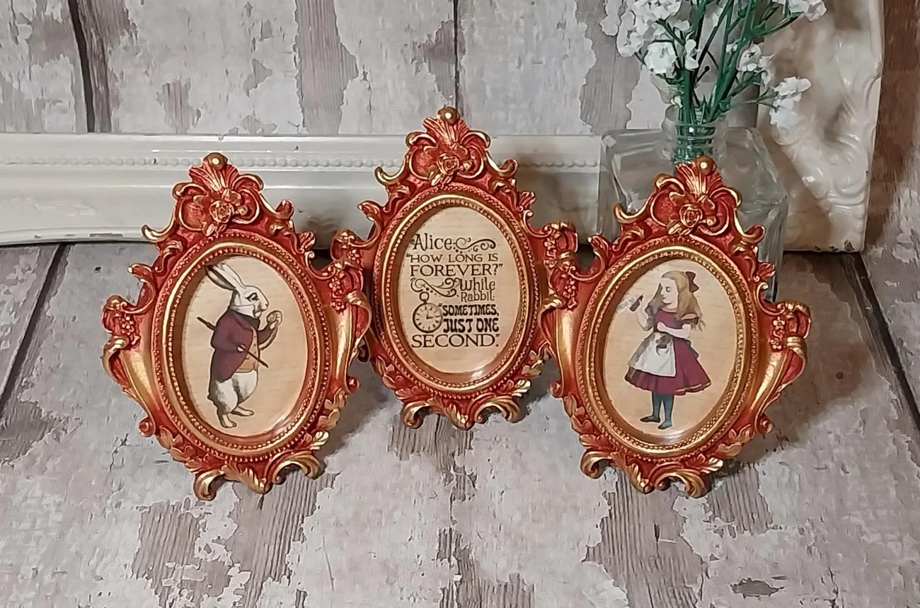 Set of 3 Alice in Wonderland mini oval pictures. Deep red and gold frame. – Artsy Craftsy