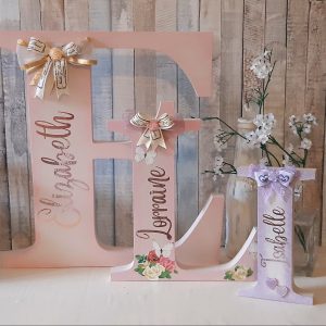 Capital freestanding letter sign. Personalised with name, decorated with lace and ribbon bow. Alphabet letter decorated ornamental plaque