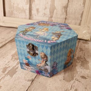 Alice in Wonderland jewellery box. Wooden hexagon keepsake storage. Mad Hatter, White Rabbit. Blue