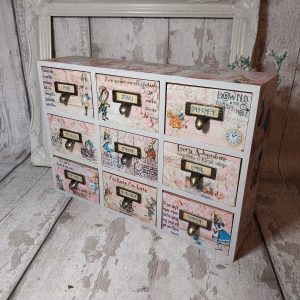 Alice in Wonderland mini chest of drawers. Mad Hatter, White rabbit, Queen of hearts 9 draw wooden box. Alice in wonderland quotes. Pink