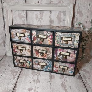 Alice in Wonderland mini chest of drawers. Mad Hatter, White rabbit, Queen of hearts wooden box. 2 Drawers.