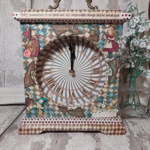 Alice in Wonderland vintage style wooden mantle clock, Mad Hatter, White Rabbit. Decorative freestanding Mad bonkers