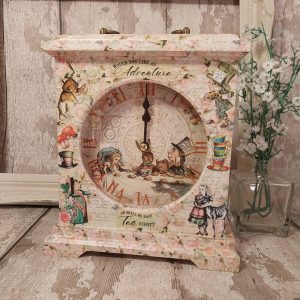 Alice in Wonderland vintage style wooden mantle clock, Mad Hatter, White Rabbit. Decorative freestanding natural colour with roses