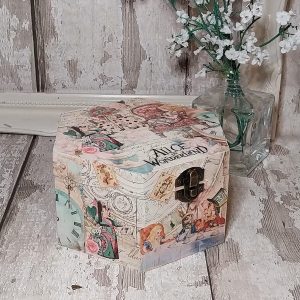 Alice in Wonderland jewellery box. Wooden hexagon keepsake storage. Mad Hatter, White Rabbit, Queen of hearts.